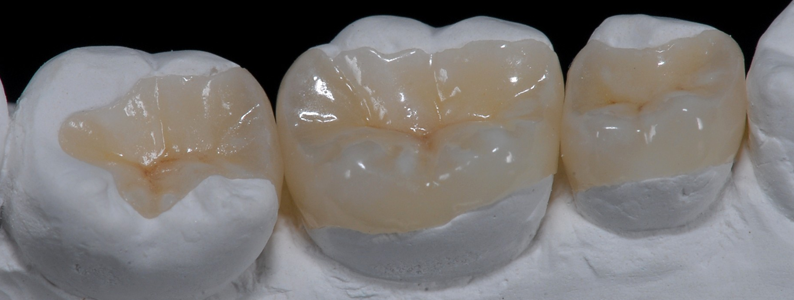 Nagy keménységű kerámiából, nagy precizitással elkészülő tömések, amelyek minden fentebb említett szempontot tökéletesen kielégítenek. Anyaguk miatt mind színükben mind fényáteresztő képességükben a legtökéletesebben utánozzák az egészséges fogat. A szájüregben előforduló mechanikai és kémiai hatásoknak teljes mértékben ellenáll, ezért akár egész életen át való tartósságot biztosít. Orvosaink technikusainkkal együttműködve minden esetben egyénileg, maximális precizitással készítik el. Ennek köszönhető pontosságuk, ami a kifogástalan tisztaságot garantálja későbbiekben a szájüregben. - Arany betét (inlay)