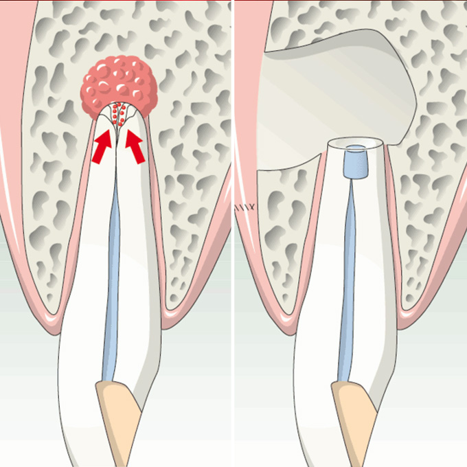 Nem tökéletes gyökértömés esetén a gyökércsúcs körül krónikus gyulladás alakul ki, ami a góckutatások során leggyakrabban diagnosztizált probléma. Csak akkor tudjuk megtartani a fogat kockázatmentesen, ha ennek a problémának nem csak tüneteit, hanem kiváltó okát is megszüntetjük. A gyökércsatorna csúcsi vége gyakran annyira elvékonyodik, hogy hagyományos úton lehetetlen korrekten előkészíteni gyökértöméshez, nem lehet eltávolítani a fertőzött ideget és foganyagot, illetve a gyökértömésre használt anyagokat sem lehet bejuttatni. Mikroszkopikus oldalcsatornák is okozhatnak problémákat a gyökér csúcsi harmadában, még akkor is, ha a gyökértömés teljesen csúcsig ér. A beavatkozással ezeket a problémákat úgy oldjuk meg, hogy csak a gyökér csúcsi részét és a körülötte lévő gyulladt szöveteket távolítjuk el, miközben a fog többi része sértetlen marad.